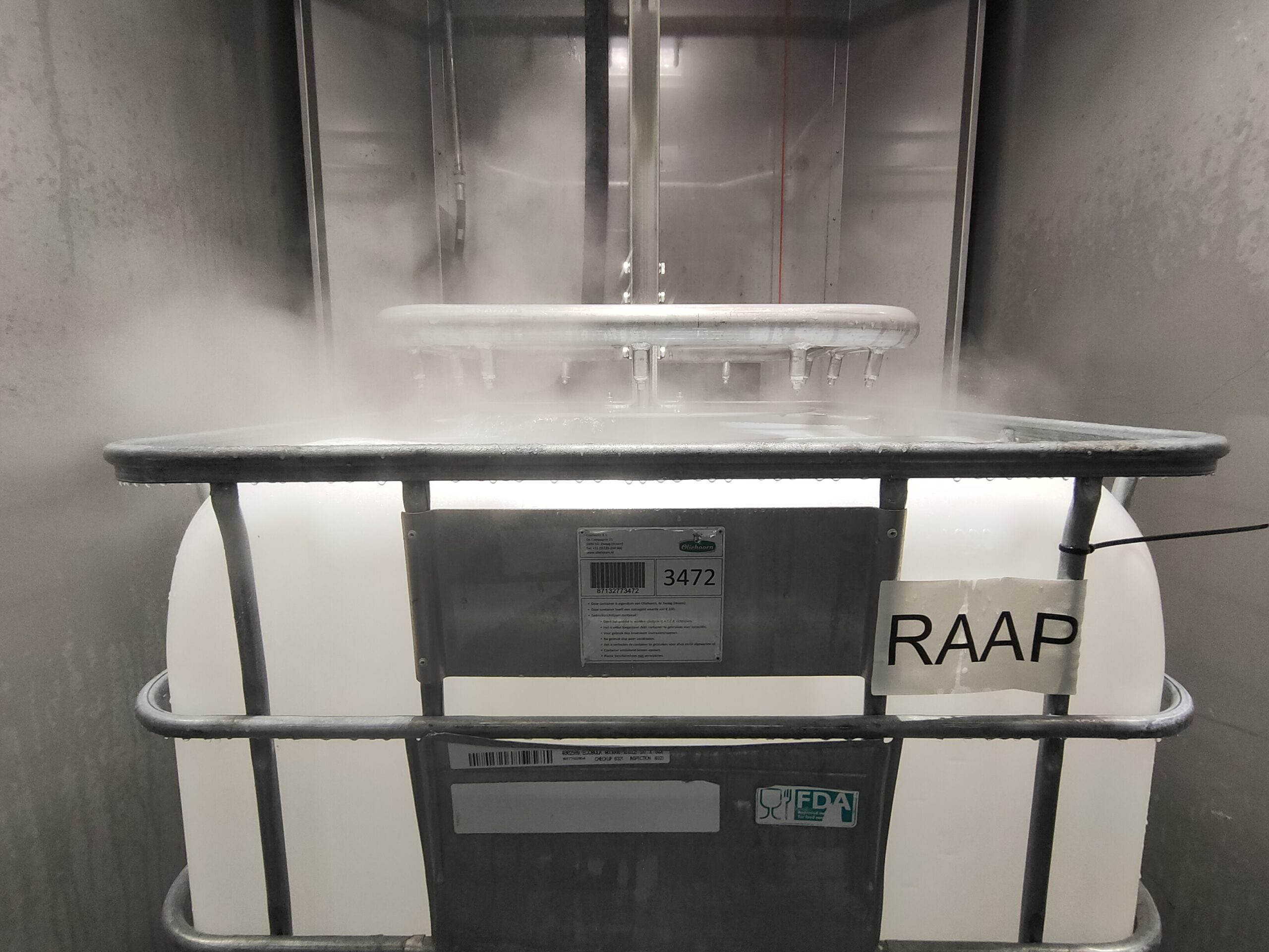 After internal cleaning, some residual water always remains in the IBC. To quickly remove this water, it is sucked from an IBC with a pump or vacuum cleaner. This can be done automatically or manually. After this, the IBC is dried by forcefully blowing hot air into the IBC through a blow pipe. Gröninger supplies Drypack drying installations for this purpose. These extraction and drying systems give very good results: the IBCs are dry within 6 minutes!
